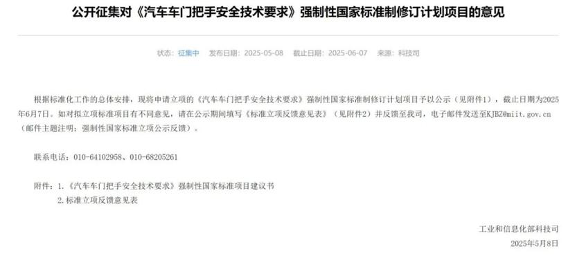 5月8日晚间,工信部官网公开征集对《汽车车门把手安全技术要求》强制性国家标准制修订计划项目的意见。从汽车产业到消费者,顿时一石激起千层浪,围绕“隐藏式门把手”和其他“鸡肋功能”的讨论此起彼伏。