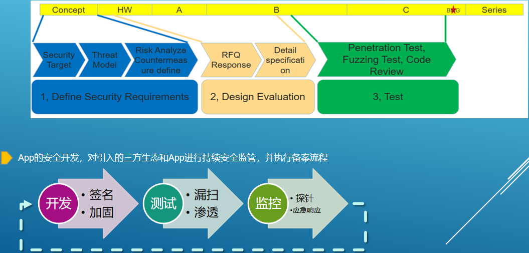车企如何将网络安全开发融入到工作流程?首先定点是最重要的,定点后,在A样B样时要有安全实现,此时要准备足够多的安全工具。最后是验证,APP和第三方生态引入对主机厂来说,并不是拿来主义,APP不是一定有安全开发和监控的过程,在开发中我们至少要签名和加固,渗透测试也是必须的,监控中对于风险大的APP还要加装探针。