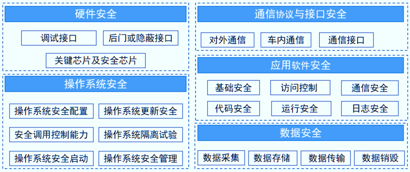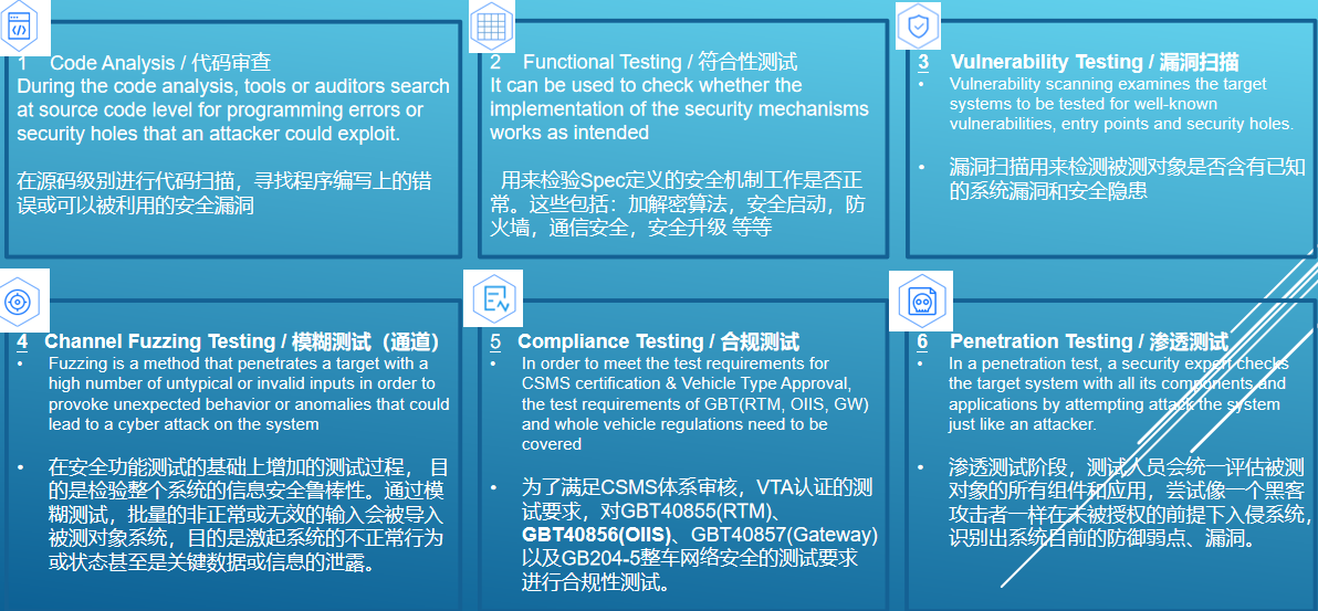总体来看,安全测试至少包含零部件级测试,如果零部件与其他模块交流较少,就用零部件级测试;如果是与用户相关的网联功能,功能级的风险测试就非常必要了。