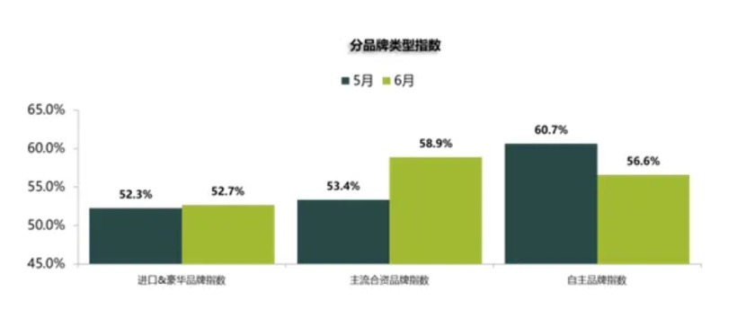 具体到品牌来看,6月份进口&豪华品牌、主流合资品牌指数环比上升。自主品牌受厂家政策影响,集中在5月发力,6月销量目标相对保守,库存水平下降。